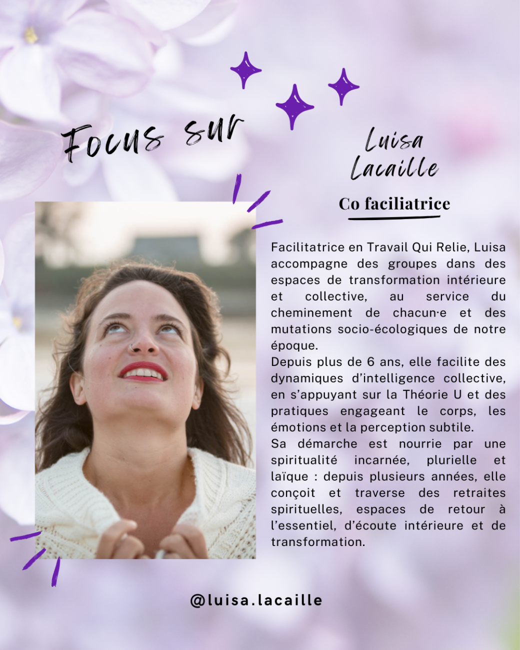 Facilitatrice en Travail qui Relie, Luisa accompagne depuis plus de six ans des groupes dans des espaces de transformation intérieure et collective, au service des mutations socio-écologiques.