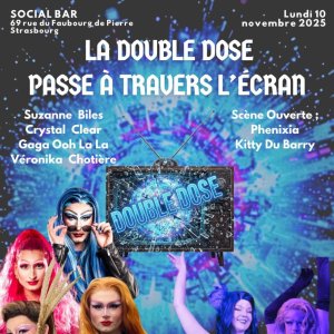 Préparez-vous à une soirée haute en couleurs et en émotions ! Le lundi 10 novembre, le Social Bar accueille une nouvelle édition de la Double Dose, avec un thème qui vous fera voyager à travers vos souvenirs d’écran : La Double Dose "Passe à travers l'écran".