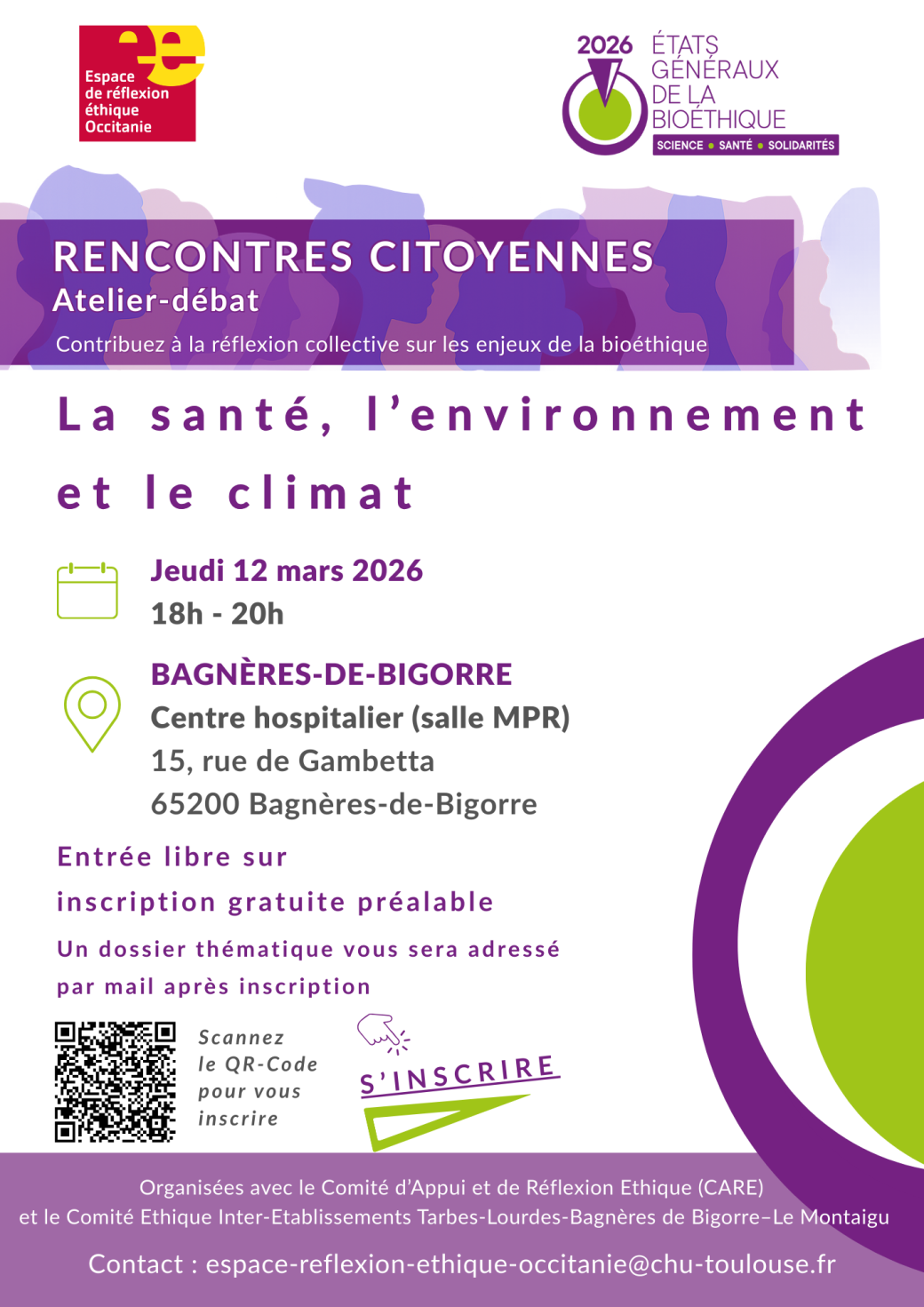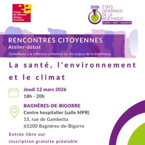 Dans le cadre des États Généraux de la Bioéthique 2026, l'Espace de réflexion éthique, en collaboration avec le Comité d’Appui et de Réflexion Ethique (CARE) et le Comité Ethique Inter-Etablissements Tarbes-Lourdes-Bagnères de Bigorre-Le Montaigu, vous invite à une rencontre citoyenne sur le thème : la santé, le climat et l'environnement