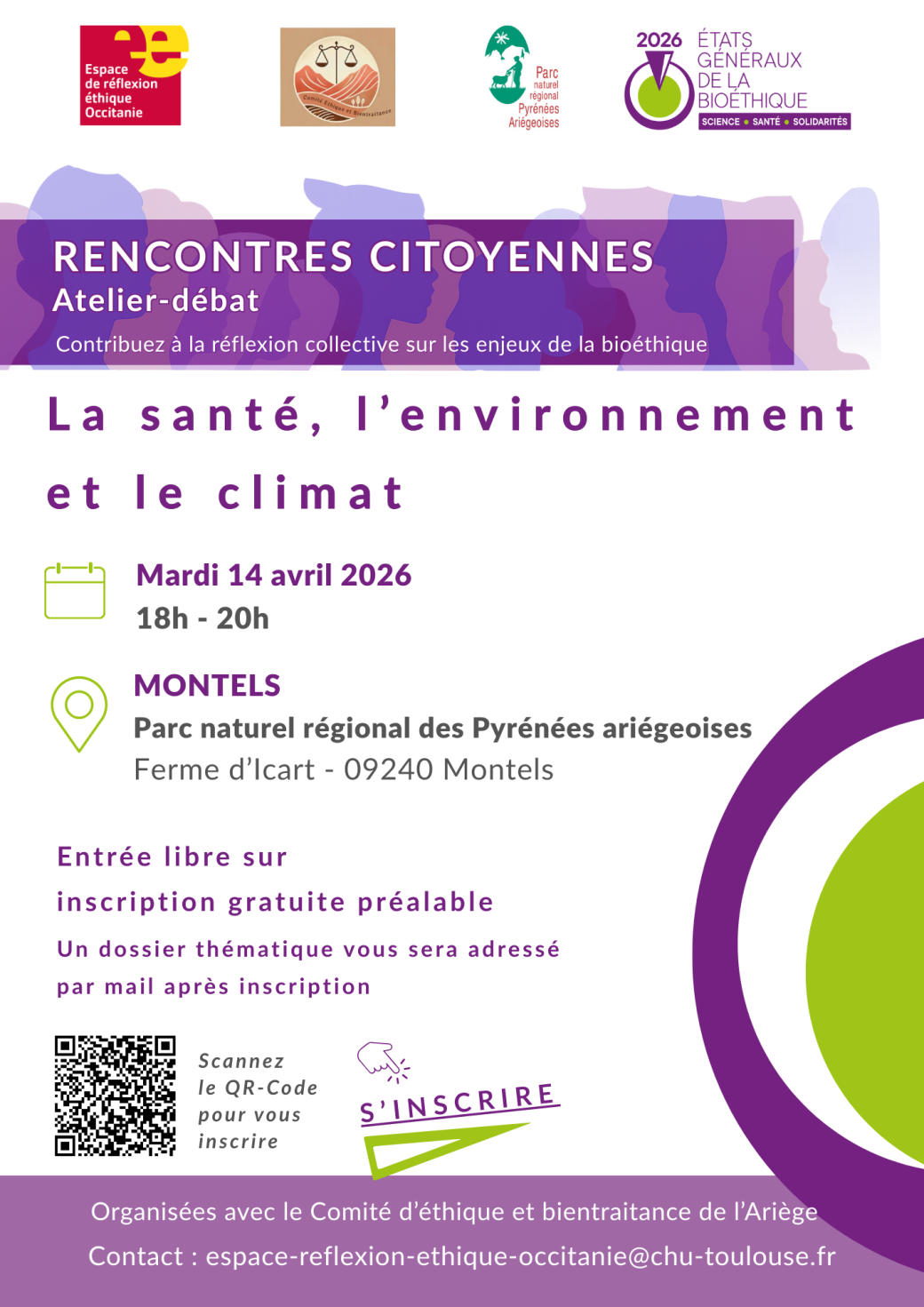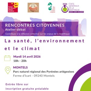 Dans le cadre des États Généraux de la Bioéthique 2026, l'Espace de réflexion éthique, en collaboration avec le Comité d'éthique et bientraitance de l'Ariège, vous invite à une rencontre citoyenne sur le thème : la santé, l'environnement et le climat