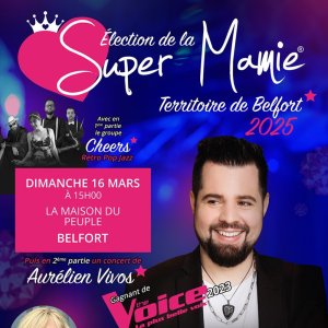 Venez applaudir la super Mamie du Territoire de Belfort ! C'est l'occasion de passer un bel après-midi festif rythmé par la musique. Première partie du spectacle, le groupe Terrifortain CHEERS qui revisite les plus grands tubes pop des années 80 à nos jours en leur donnant des couleurs jazz, soul,funk, puis présentation des cinq candidates. Concert final avec Aurélien VIVOS gagnant de The Voice 2023 et son pianiste, une voix impressionnante...-Ville de Belfort