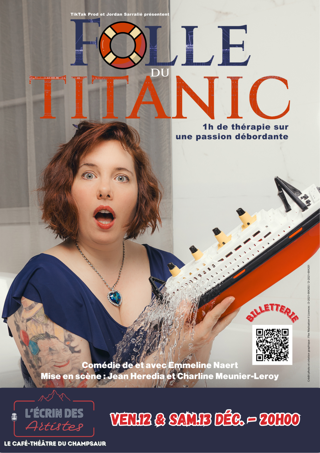 Ce one woman show, mis en scène par Jean Heredia, traite le thème du Titanic de manière très décalée, absurde, mêlant sketchs, personnages, comique de situations et chansons.