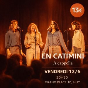2026-06-12 20:00:00 2026-06-12 22:00:00 Europe/Brussels En Catimini Reservations on : https://www.billetweb.fr/en-catimini -- ✨ Elles sont 4… elles chantent… et la magie opère ✨ Le groupe En Catimini revient au Sofloti pour une soirée 100% a cappella pleine d’émotions, d’harmonie et de surprises… Quatre voix, aucune instrumentation… et pourtant tout y est. De la douceur, de l’énergie, de l’humour et surtout… un moment suspendu qui ne laisse personne indifférent. - Ouverture des portes : 18H30 - Spectacle : 20H30  - Prévente : 13€ (jusqu'au 11/6) - Sur place le jour J : 17€ (si il reste des places) Sofloti, Grand Place, Huy, Belgique Sofloti