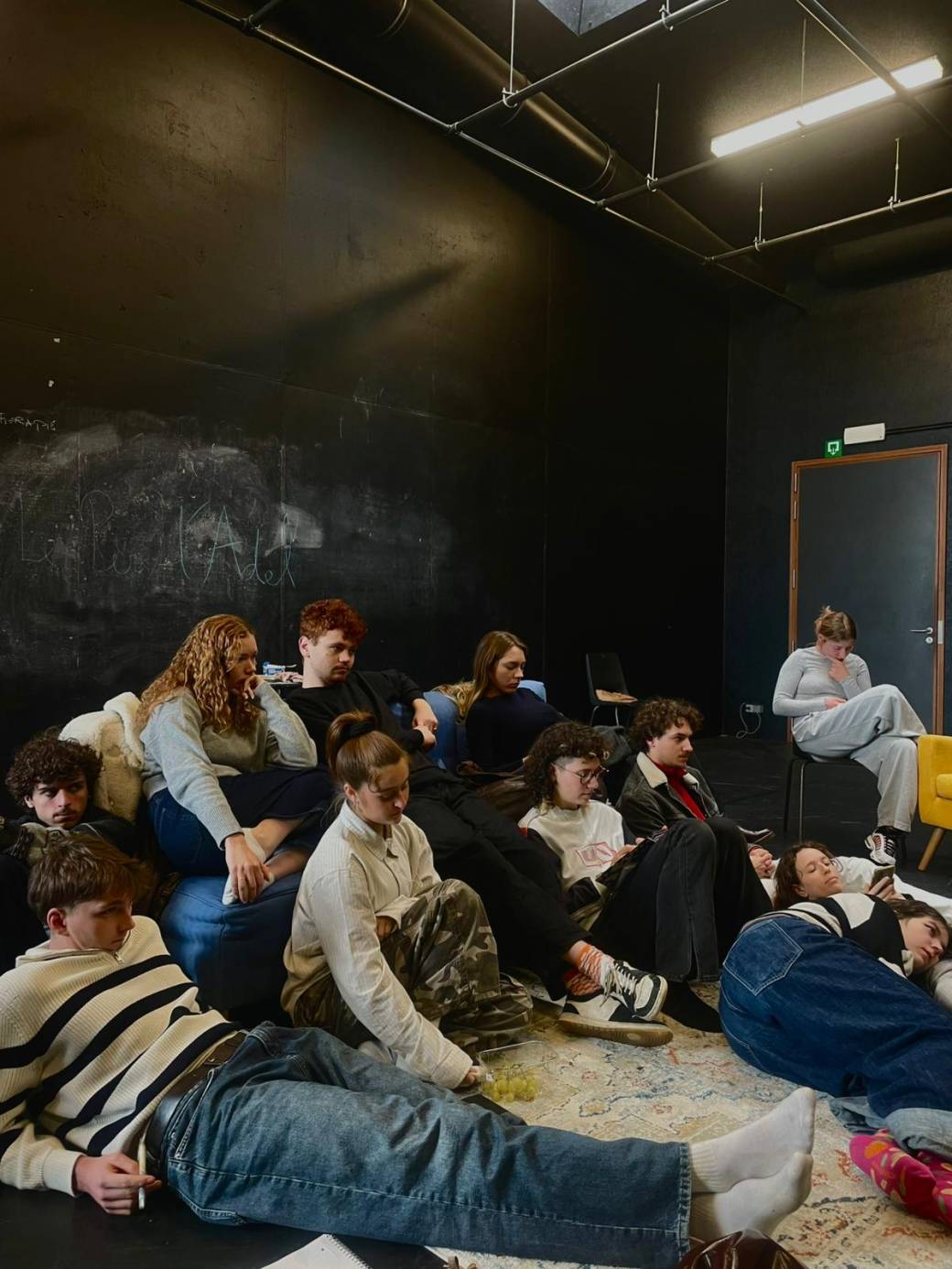 Comment reproduire cette vérité ? Partir de ce qui est au plus proche d'elleux, à savoir des étudiant.e.s dans une classe d'interprétation dramatique, et glisser vers le jeu. Interroger les différentes couches de jeux. Comment travailler sur l'hyper réalisme mais sur un plateau de théâtre, le corps déployé dans l'espace. L'acteurice sensible, tout en rupture.