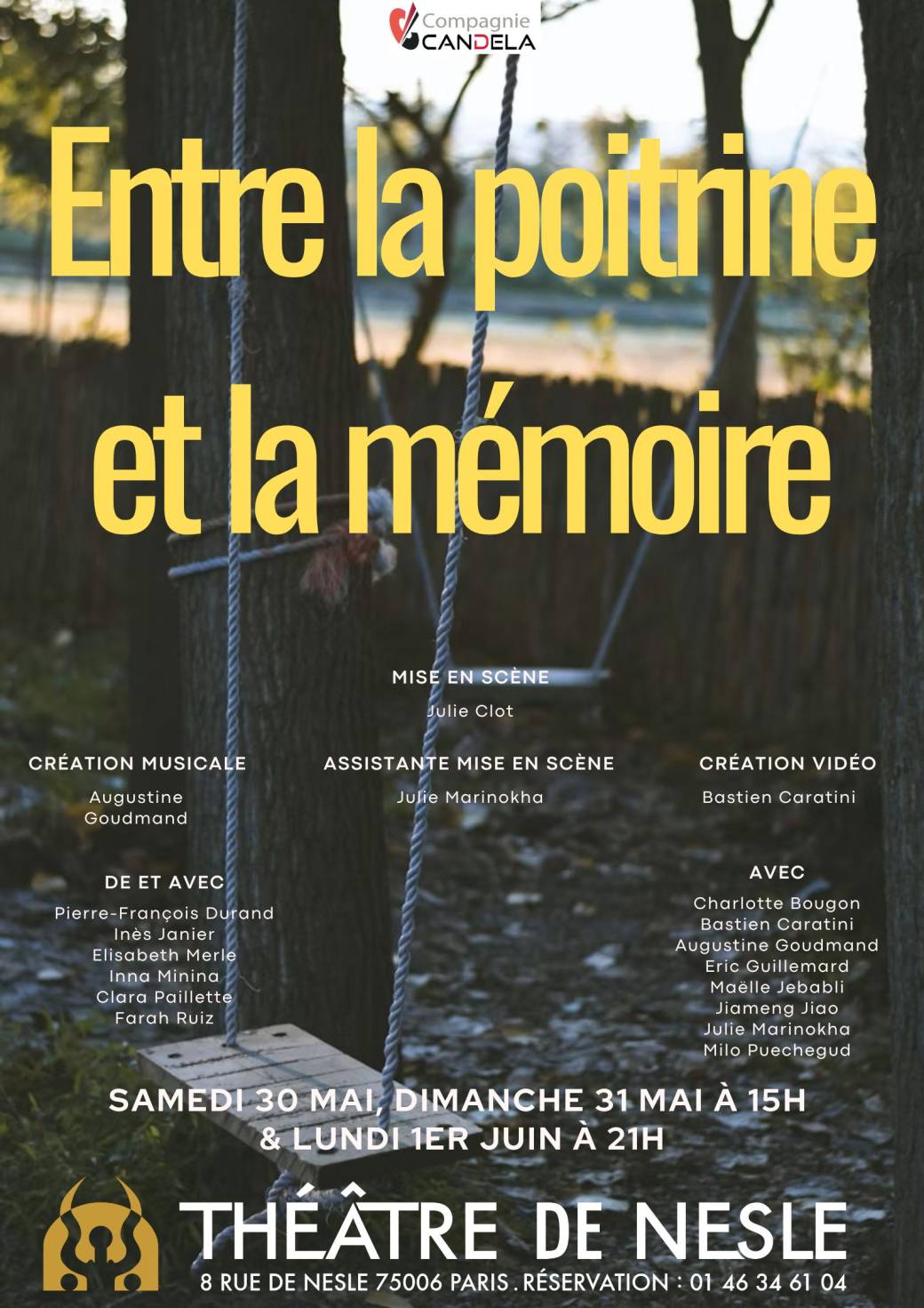 Entre la poitrine et la mémoire s'intéresse aux difficultés de ces relations qui nous ont construit et qui, entre tensions, déchirements, réglements et confrontations disent l’amour qui ne va pas de soi, en contrepoint de la famille idéale ou fantasmée.