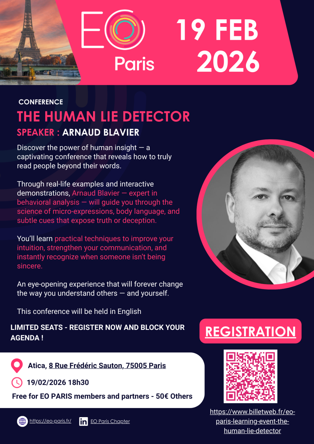 2026-02-19 17:30:002026-02-19 23:30:00Europe/ParisEO Paris Learning event : The Human Lie DetectorReservations on : https://www.billetweb.fr/eo-paris-learning-event-the-human-lie-detector
