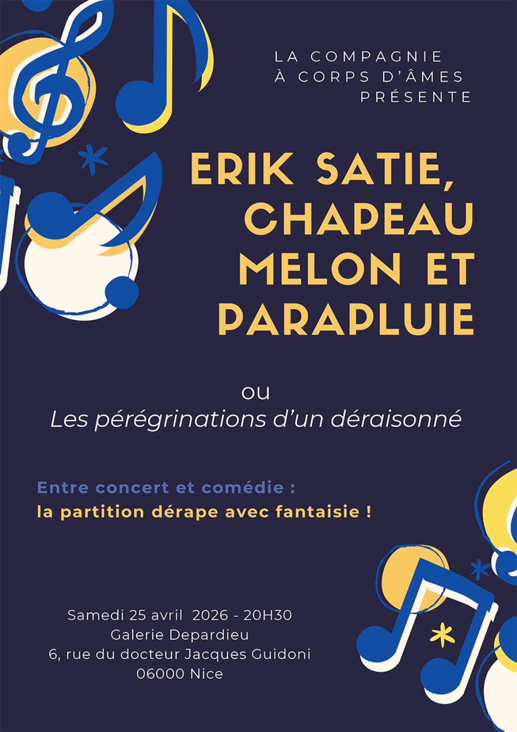 Ce spectacle imaginé comme un dialogue entre le compositeur Erik Satie et quelques amis-artistes qui ont partagé son chemin, vous invite à découvrir, au-delà de l’image excentrique bien connue du personnage, diverses facettes de son parcours: ses débuts comme pianiste au célèbre cabaret Le Chat Noir, son amitié avec Claude Debussy, son unique relation amoureuse avec Suzanne Valadon et son univers contrasté tour à tour burlesque, poétique ou tragique.