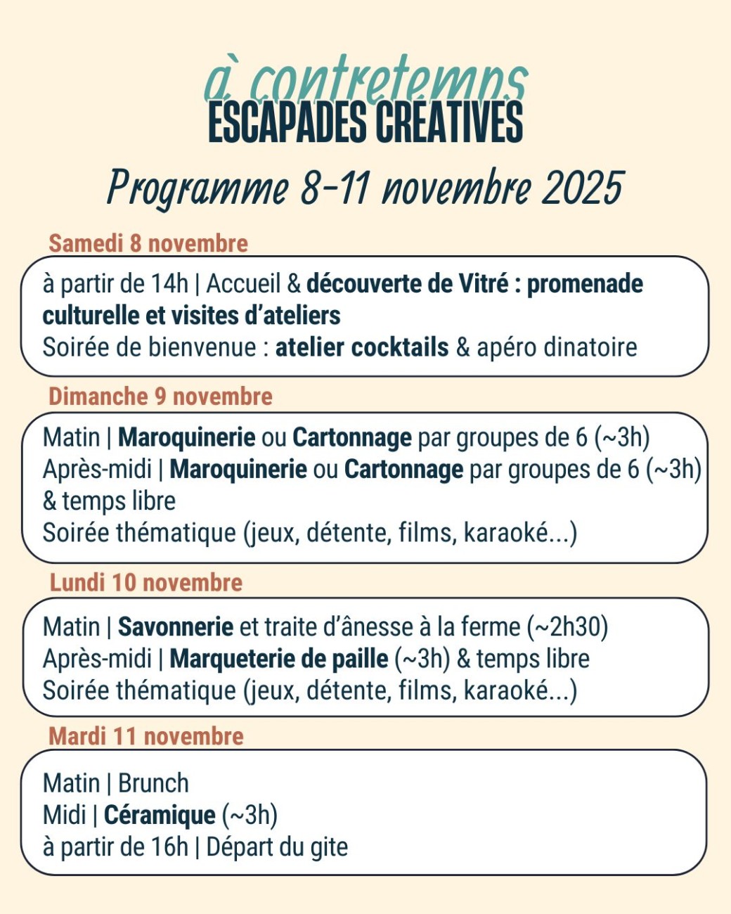 “Nos escapades à contretemps sont l'occasion rêvée de ralentir un peu le temps, dans un environnement propice à l'exploration personnelle et artistique.”