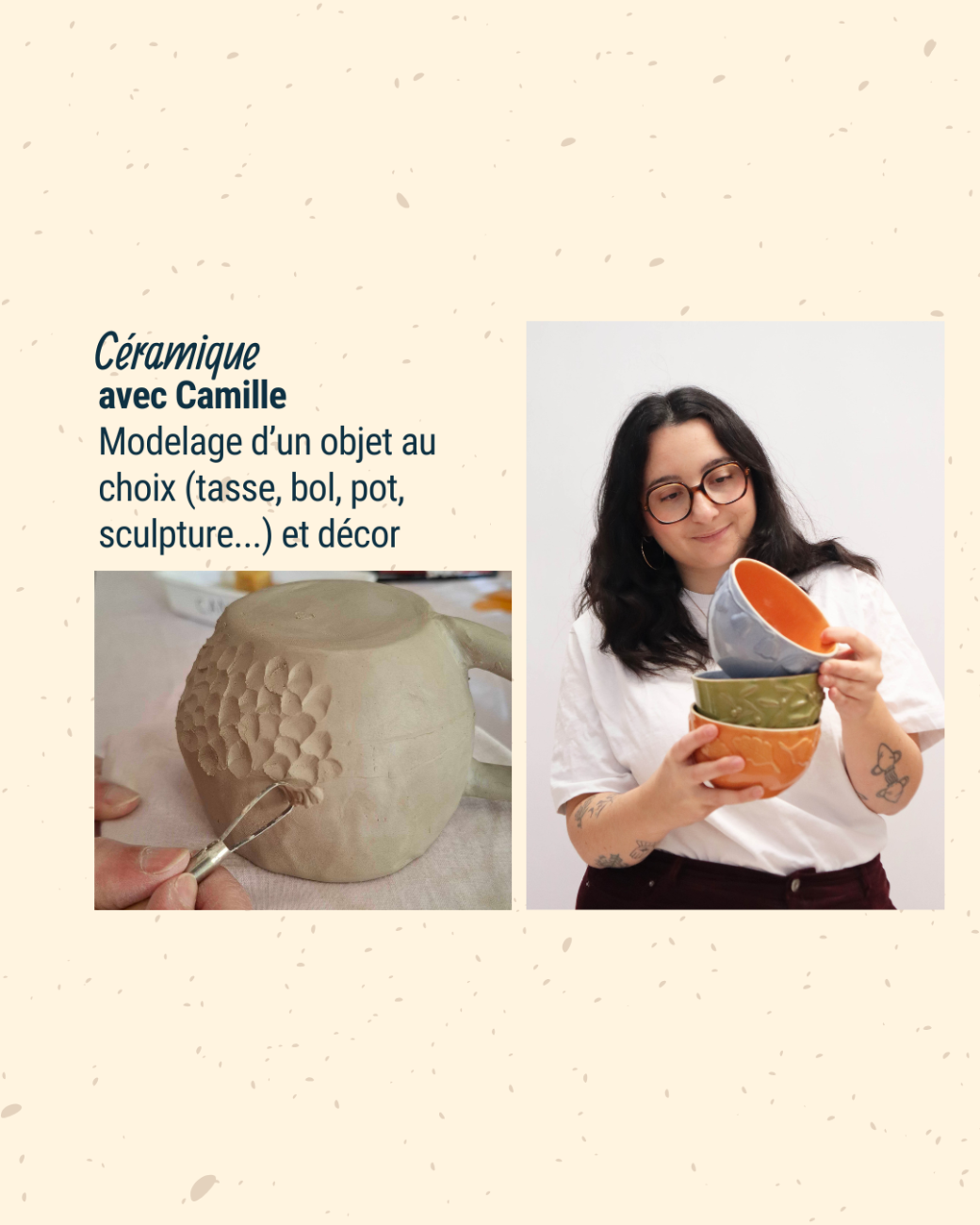 - La terre et la céramique : vous pourrez modeler l'objet de votre choix (tasse, bol, pot, sculpture...) et le décorer avec les couleurs pop de Camille