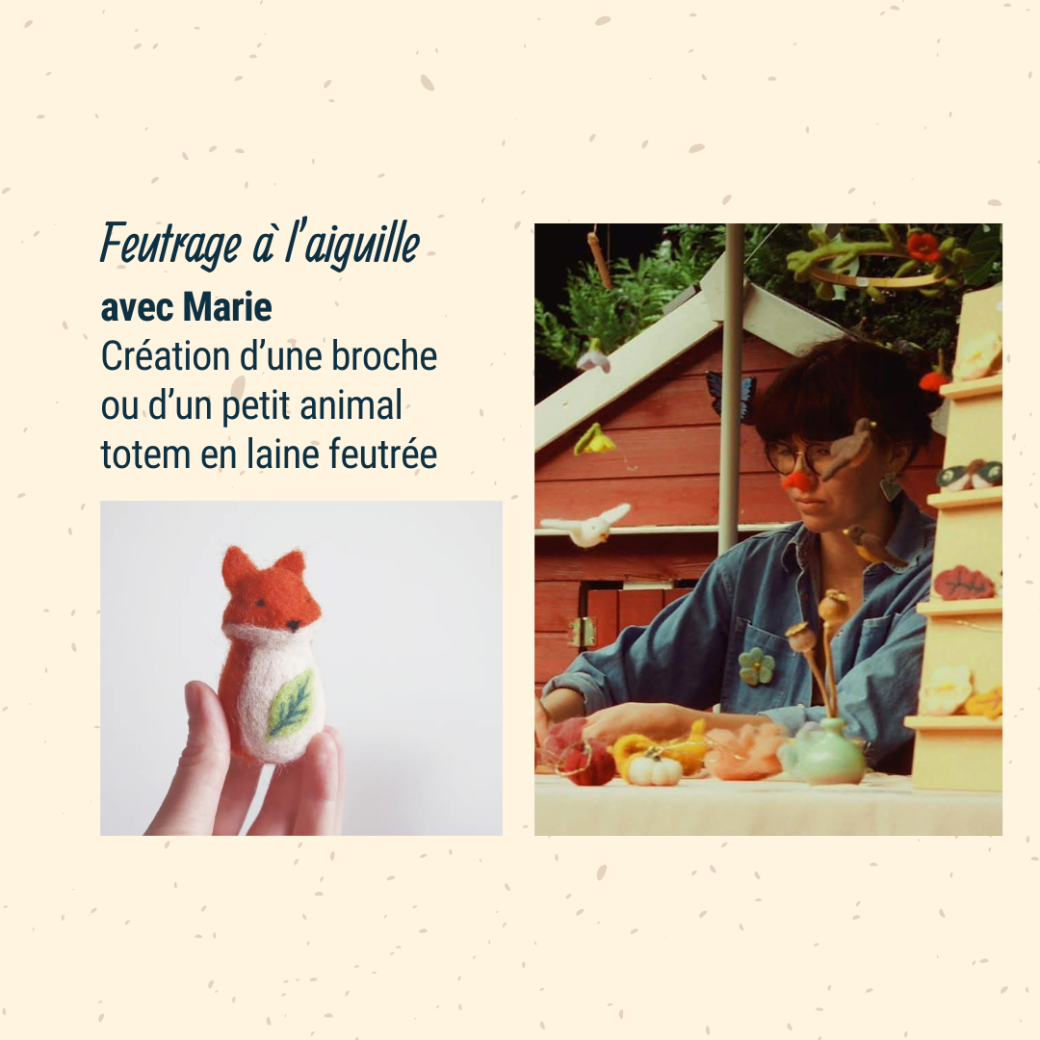 - Feutrage à l'aiguille : grâce à cette technique particulière de feutrage, Marie vous accompagnera pour créer un petit animal totem