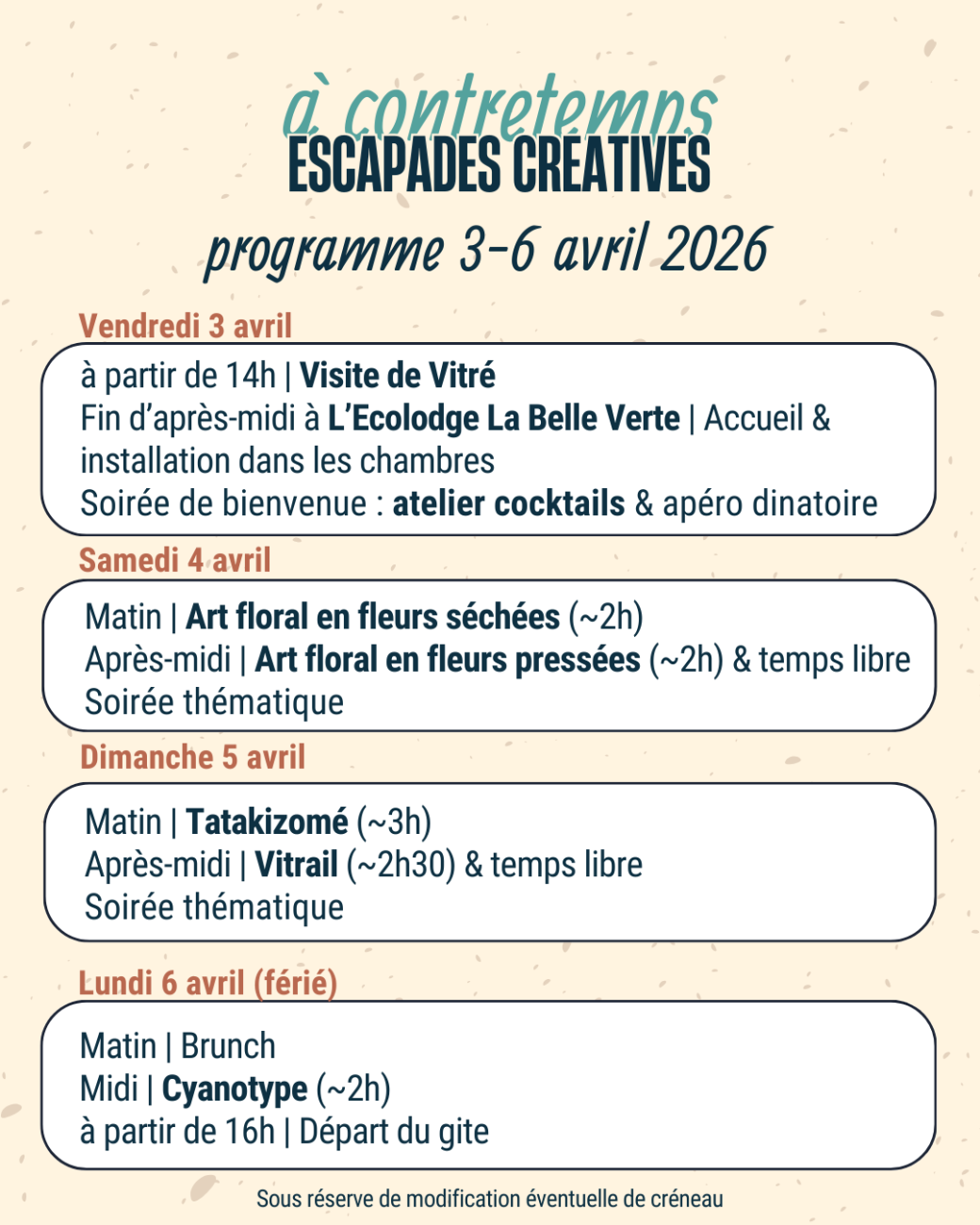 “Nos escapades à contretemps sont l'occasion rêvée de ralentir un peu le temps, dans un environnement propice à l'exploration personnelle et artistique.”