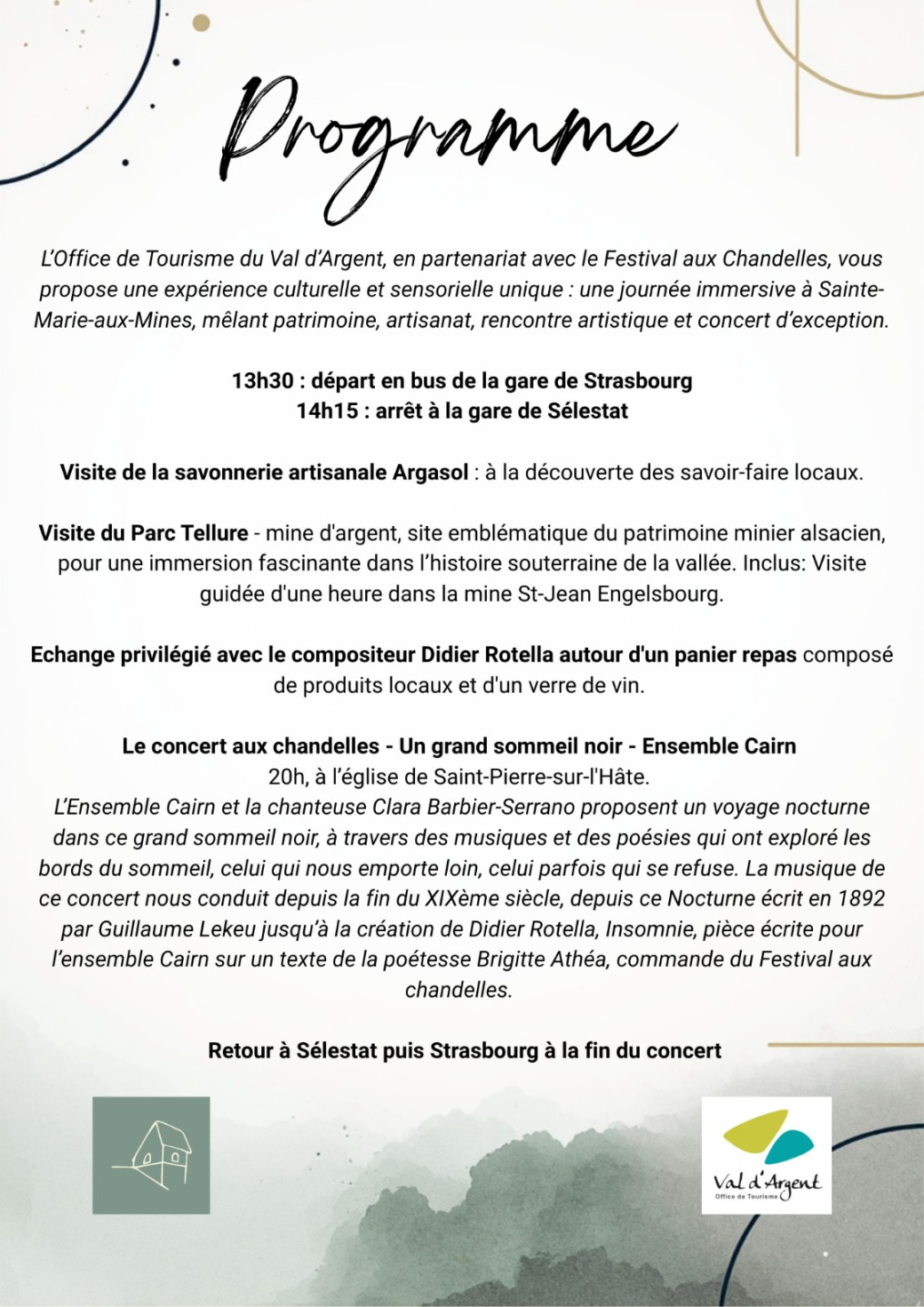 Au départ de Strasbourg et Sélestat, vivez une journée immersive à Sainte-Marie-aux-Mines : visite de la savonnerie Argasol et du parc Tellure, Rencontre avec le compositeur Didier Rotella autour du repas, puis concert aux chandelles avec l’Ensemble Cairn à Saint-Pierre-sur-l’Hâte. Tout inclus.