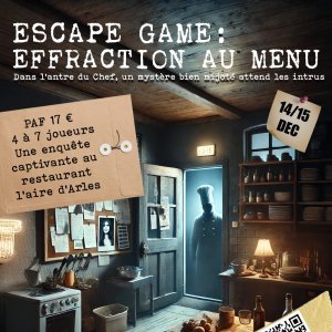 Plongez dans une aventure captivante avec notre escape game créé par Laokess - Aventures Immersives, organisé en partenariat avec l’Aire d’Arles. Une jeune femme a mystérieusement disparu… Tous les indices semblent mener au cuisinier du bar-restaurant. À vous de vous introduire chez lui pour percer le mystère et découvrir la vérité.