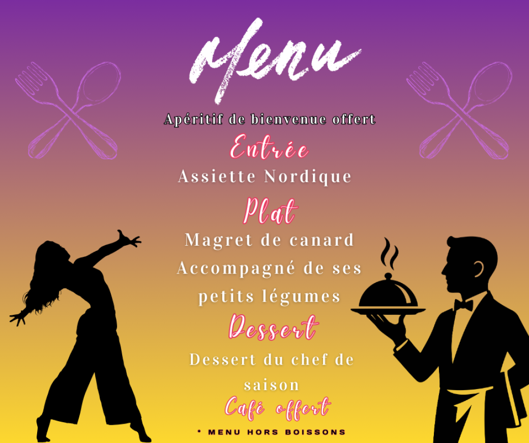 Un magnifique voyage dansant et chantant à travers l'Europe. La scène accueillera 4 Artistes dont 2 danseuses, chanteuse et chanteur pour le plus grand plaisir des sens. Un Dj animera la soirée dansante qui en suivra. Un moment divin autour d'un dîner-spectacle enchanteur avec le traiteur du cabaret Saint-Michel. Tout cela sera à partager entre amis, en famille pour un instant de pur bonheur...Dîner-spectacle 59€ hors boissons (Apéro maison et café offerts)ez votre description