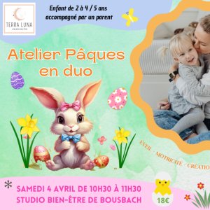 Activités créatives autour du thème de Pâques, manipulation, exploration sensorielle, petits jeux et moment convivial dans un cadre bienveillant.