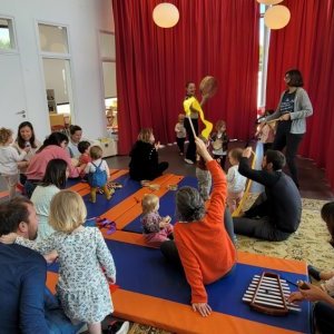 C'est un temps de partage, d’écoute, de découvertes et de manipulations, dans une atmosphère chantée et dansée. Cette séance d’éveil musical offre des moments ritualisés pour que l’enfant se repère au fil des séances. Nous attachons de l’importance à l’esprit collectif d’échange, de partage et encourageons la participation active des adultes à s’impliquer, jouer, chanter et danser...