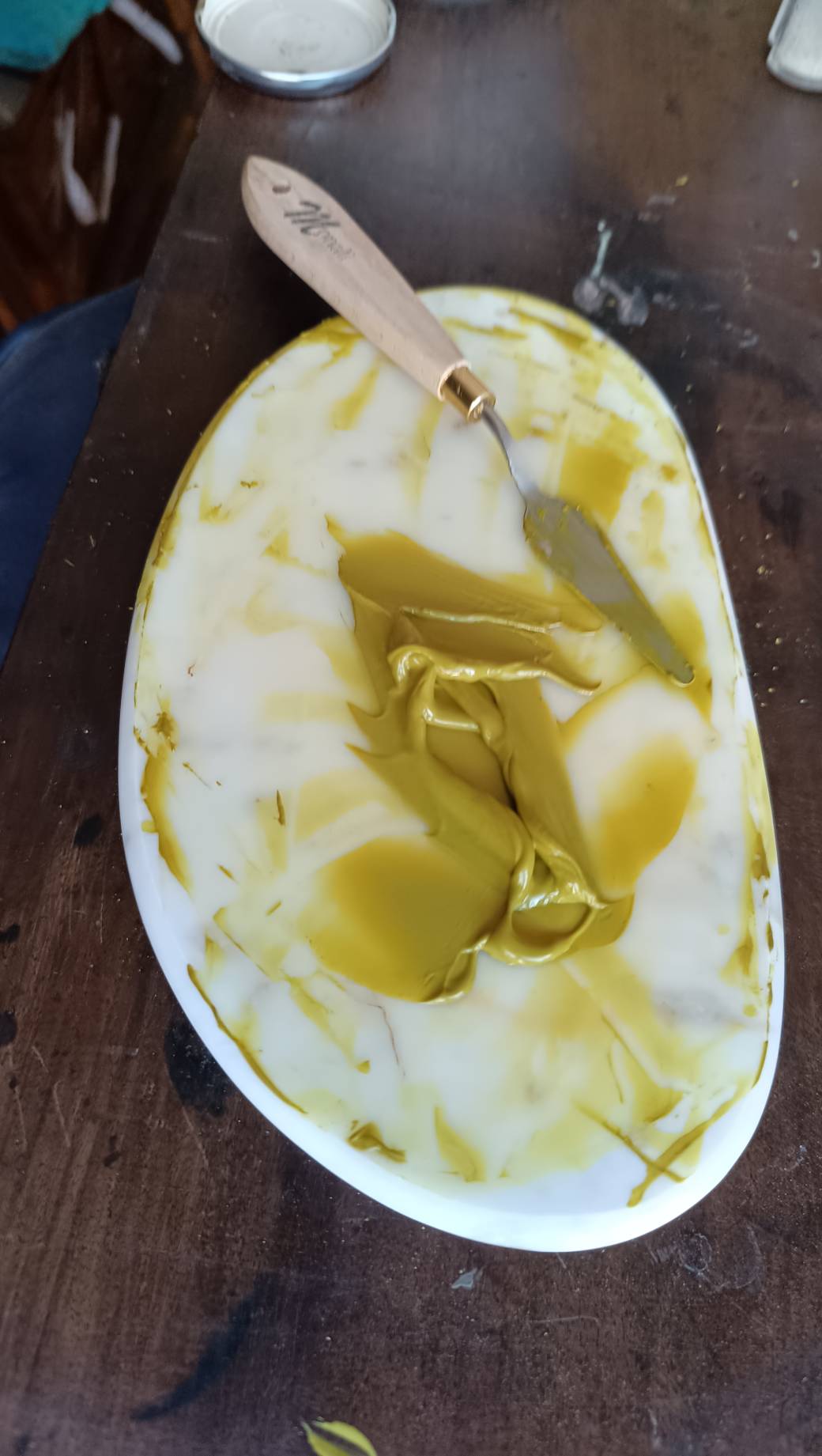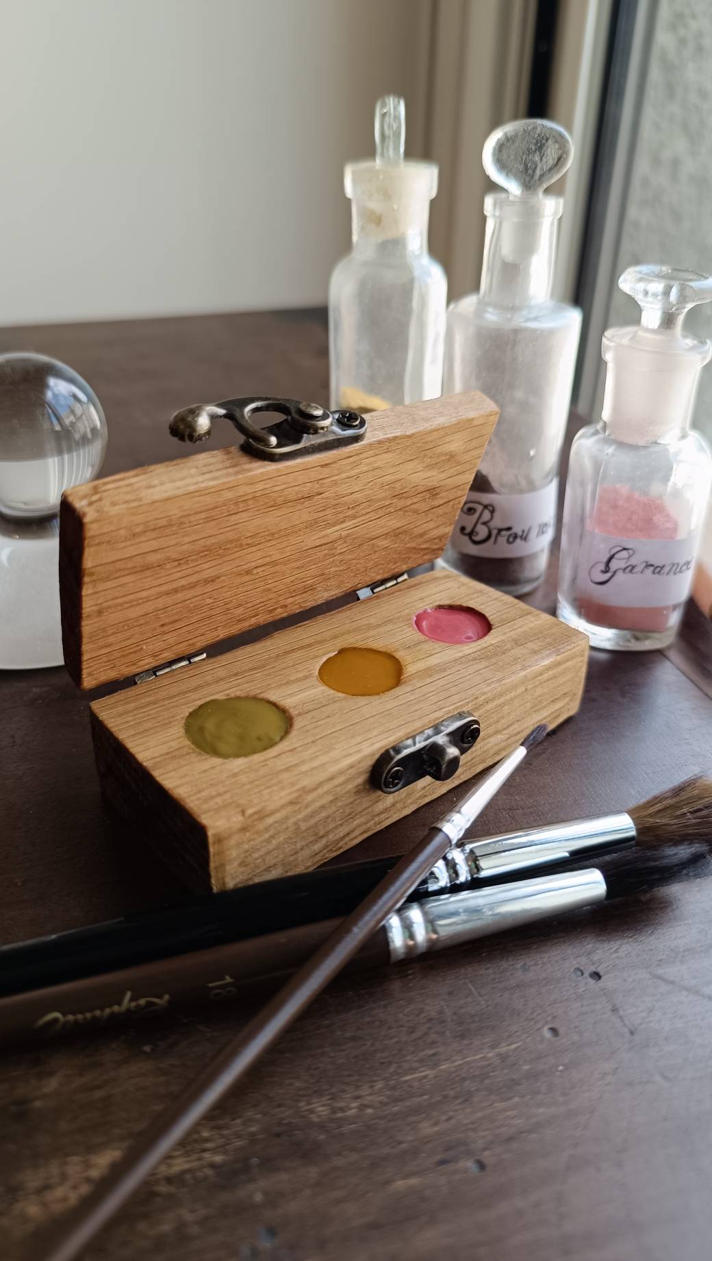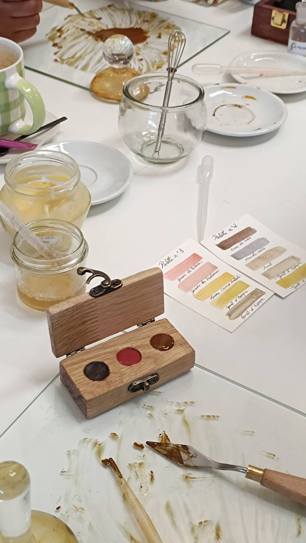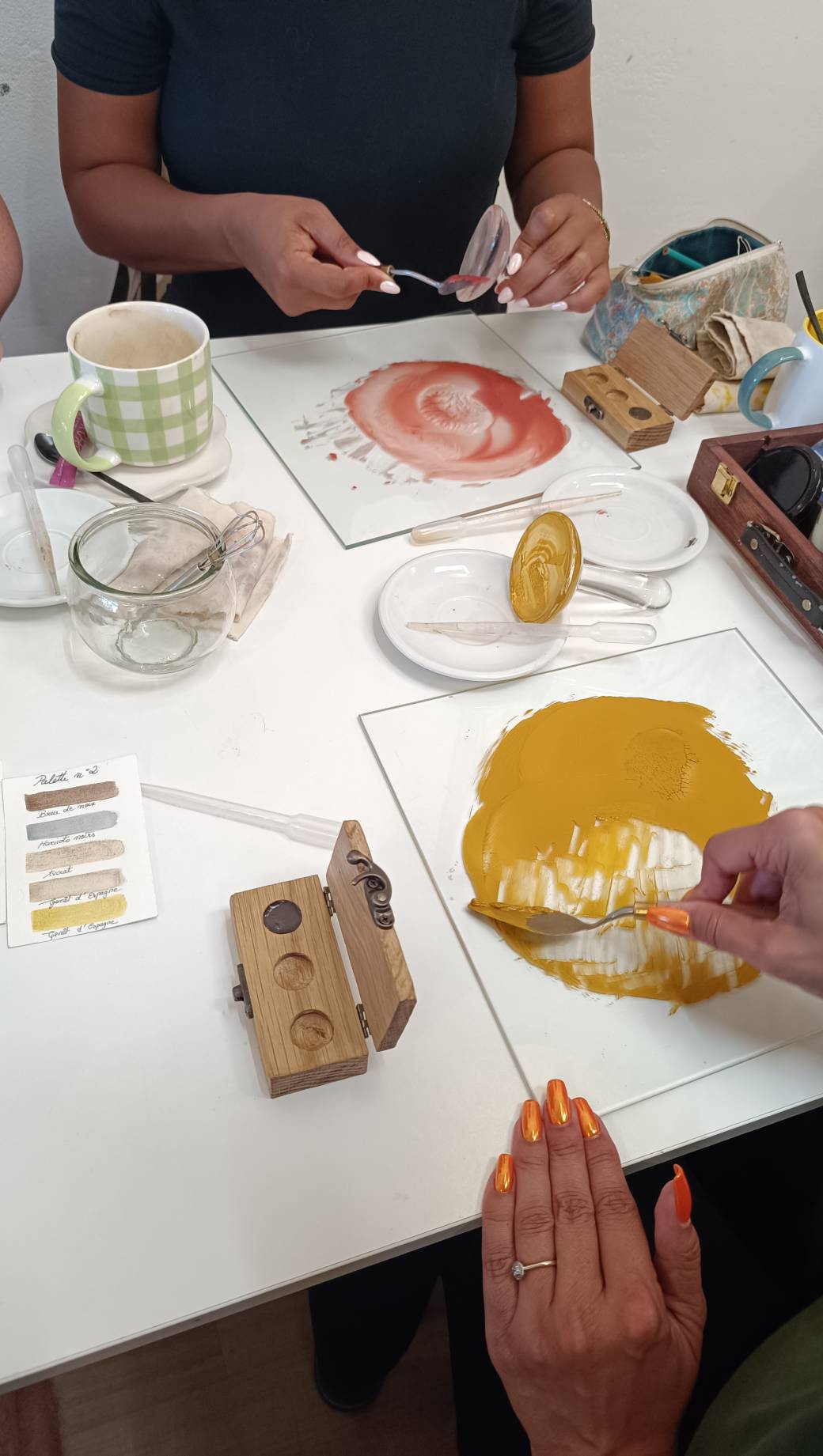Tu commenceras par imperméabiliser ta palette en bois pour la protéger de l’humidité et y couler tes couleurs. Ensuite, à l’aide de mon nuancier, tu choisiras les trois teintes qui composeront ta palette avant de broyer les pigments avec la molette en verre. Une fois les couleurs prêtes, tu les couleras dans ta palette.