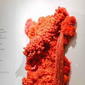 À partir de matériaux récupérés (filets alimentaires, bouchons en plastique, tubes de feutres), elle recompose une faune et une flore sous-marines aussi riches qu’imaginaires.