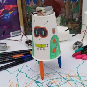 Viens écouter des histoires de petits robots courageux. Puis tu personnaliseras ton robot zigoto : celui-ci se déplace en vibrant grâce à son petit moteur. Avec ces pattes-feutres, il se met alors à dessiner des motifs fous !