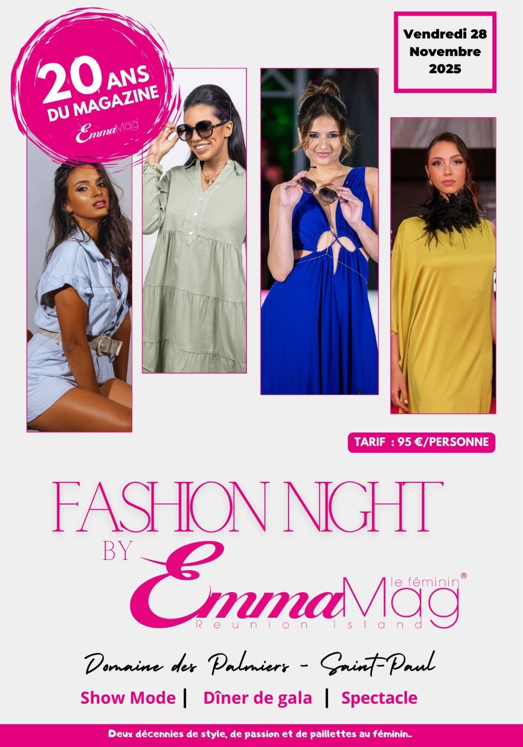 Rejoins-nous pour une soirée exceptionnelle placée sous le signe du pink glamour. Pour ses 20 ans, le magazine Emma Mag t’invite à un événement unique mêlant mode, musique et émotions, dans le cadre enchanteur du Domaine des Palmiers à Saint-Paul.