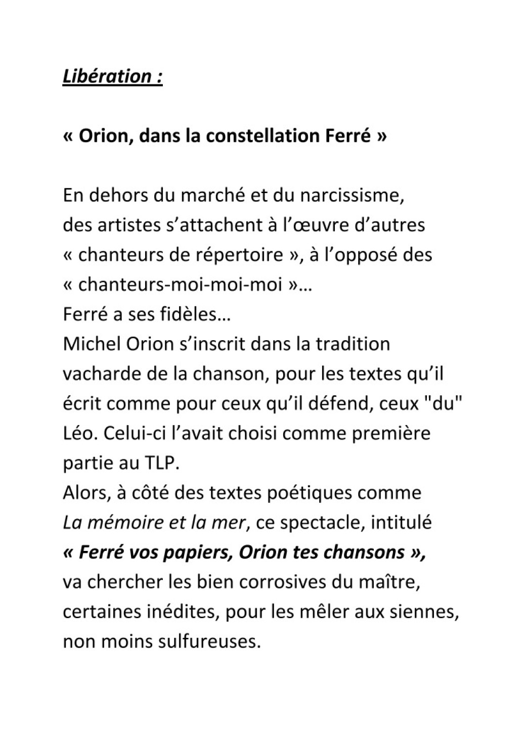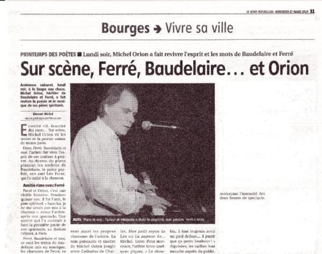 « Les notes retentissent et me replongent dans le silence intérieur et l’univers musical et poétique de Ferré et Baudelaire. Quelques notes de mélancolie douce comme pour broyer du rose et Orion entame son tour de chant.