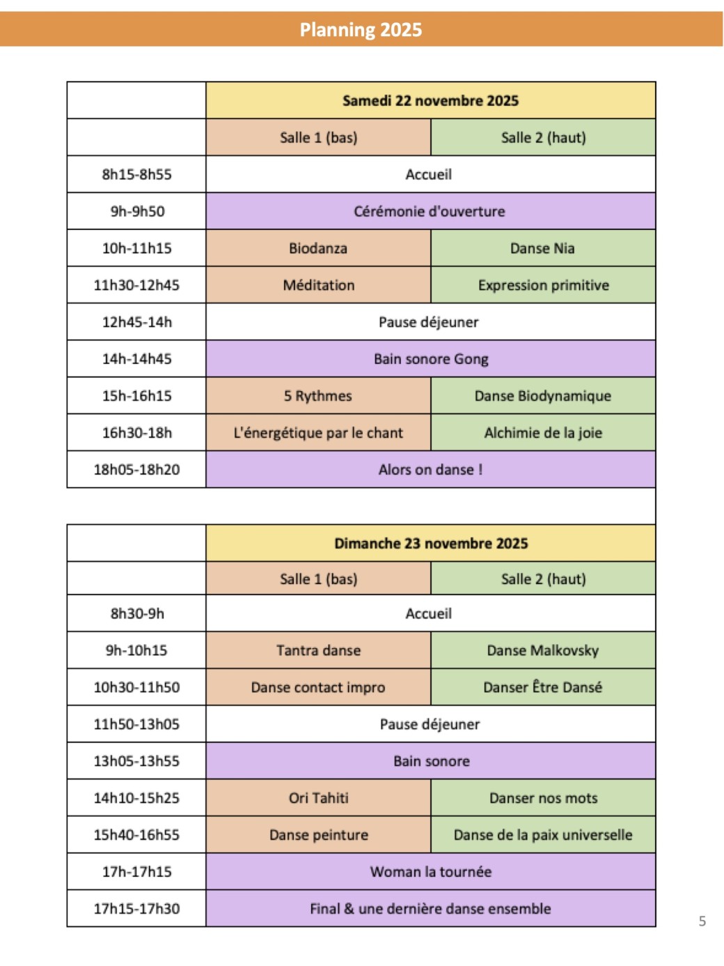 Un festival qui célèbre les danses « en conscience » dans leur diversité. Qu’elles soient libres, guidées, ritualisées, dynamiques ou plus intériorisées, elles sont sources de bien-être. Elles privilégient le ressenti, l’expression de soi, la créativité et la connexion aux autres. Pour faciliter l’intégration des expériences vécues, un voyage au cœur du son et de la voix est également proposé. Au fil des ateliers, des liens privilégiés se tissent au sein du groupe pour danser et vibrer ensemble