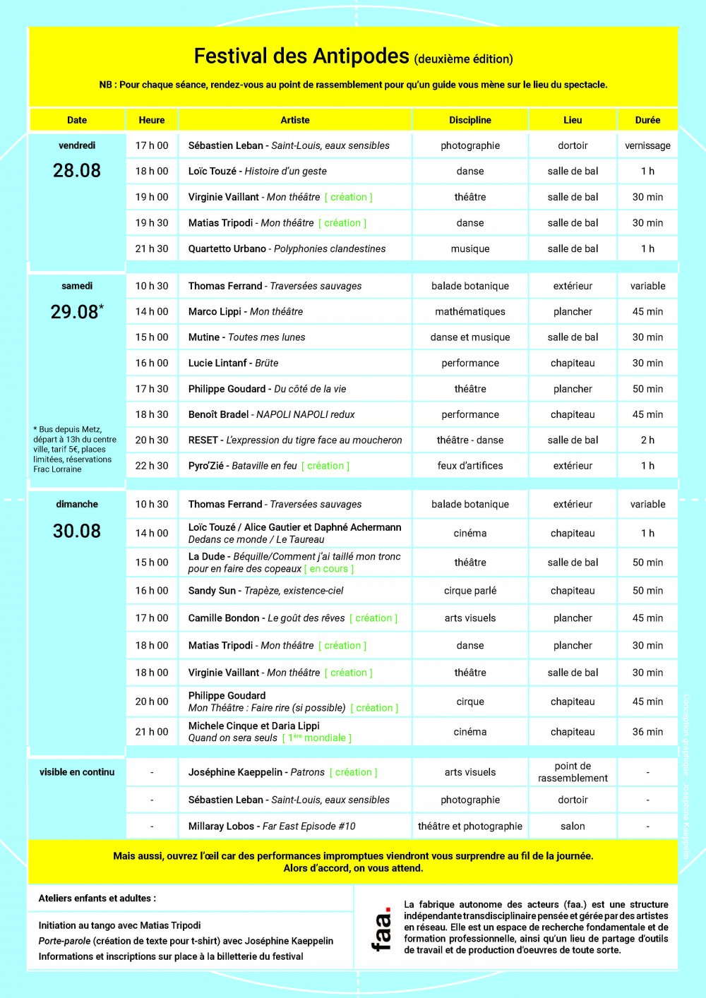 Dans l’esprit de la fabrique autonome des acteurs, le Festival des Antipodes est entièrement pensé, organisé et réalisé par les artistes qui s’y produisent. Co-programmé avec la complicité d’une équipe élargie proche des chevilles ouvrières de la faa, le festival se veut un lieu de rencontre entre des artistes, un lieu de croisement des pratiques et de partage avec le public.