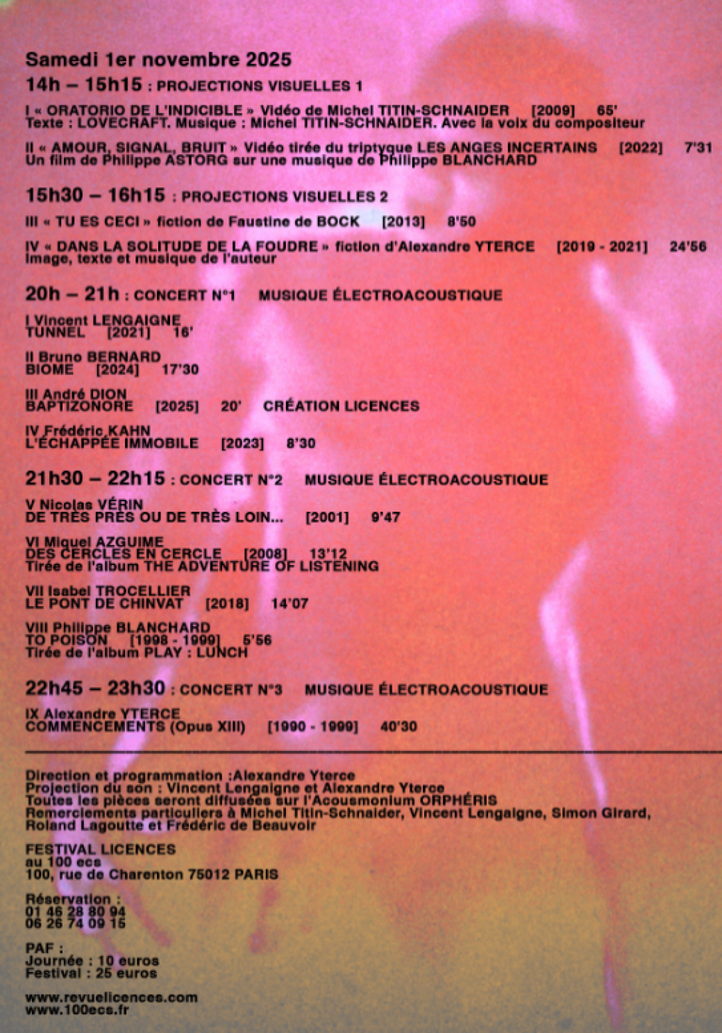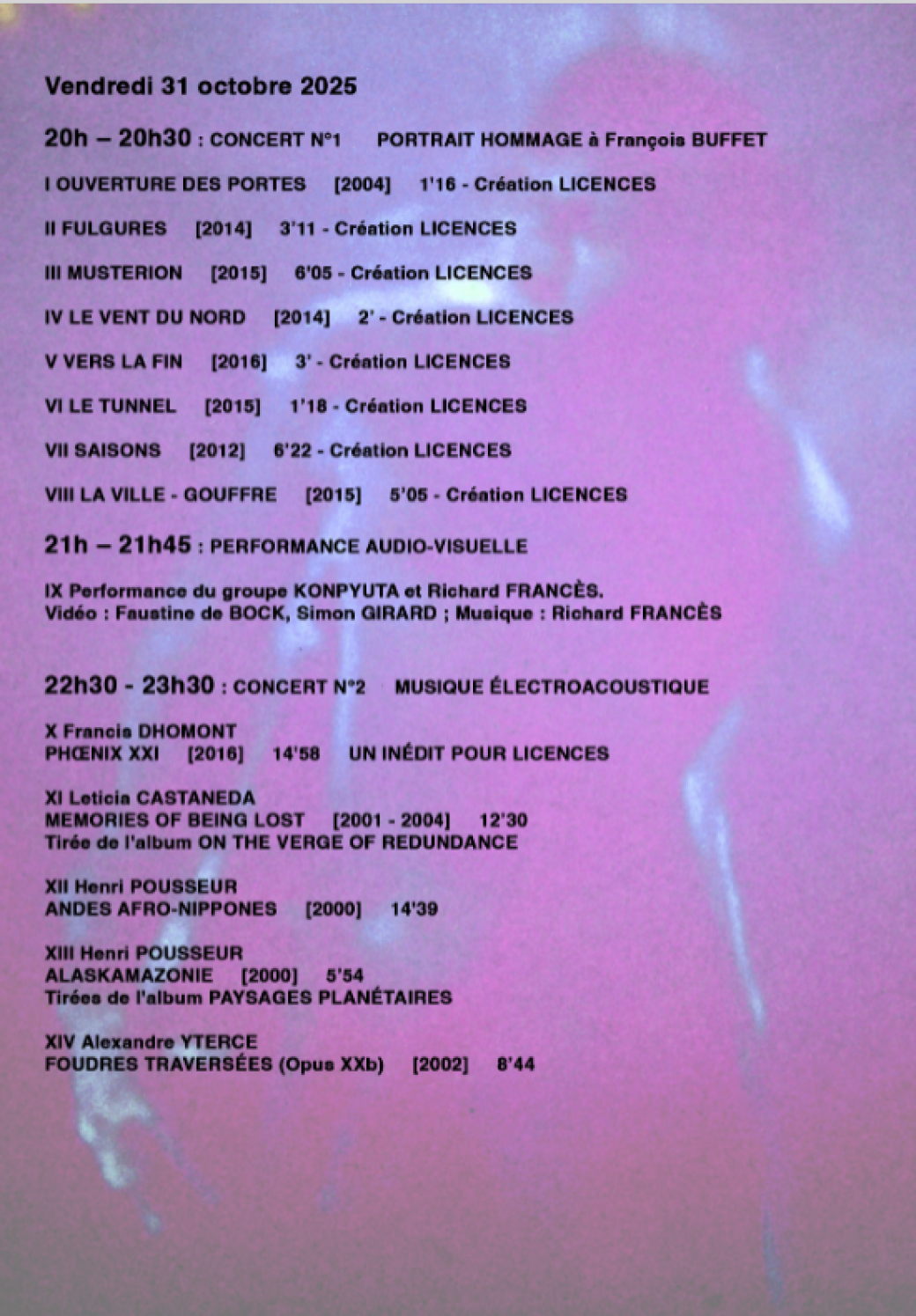 Toutes les pièces seront diffusées sur l'Acousmonium ORPHERIS de l'association AEA