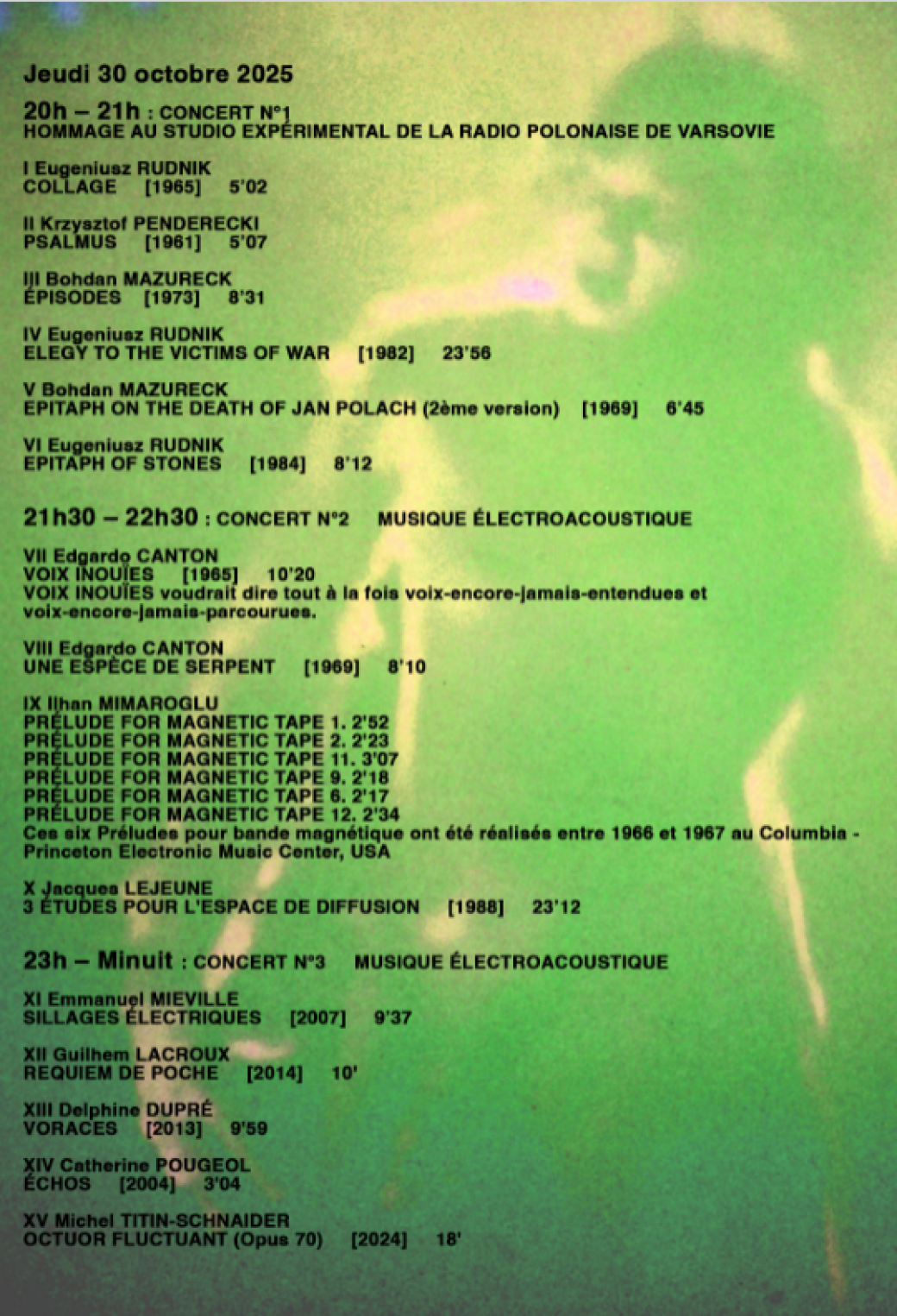 Cette 17e édition comprendra une série de concerts mettant en avant des pièces musicales atypiques, un hommage au studio expérimental de la radio polonaise de Varsovie, un portrait hommage à François Buffet, deux séances de projections visuelles et des pièces incontournables de compositeurs tels que Jacques Lejeune, Francis Dhomont,...
