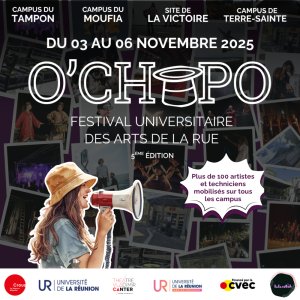 2025-11-03 12:00:00 2025-11-06 21:00:00 Asia/Dubai FESTIVAL O'CHAPO | 5e édition Reservations on : https://www.billetweb.fr/festival-ochapo-5e-edition -- Pour sa 5e édition, le festival O’Chapo revient du 03 au 06 novembre 2025 pour célébrer les arts de la rue sous toutes leurs formes ! Près d’une quinzaine de compagnies investiront les campus du Tampon, de Terre Sainte, du Moufia et le site de La Victoire, proposant des spectacles de danse, de théâtre, de musique et de cirque. >>  PROGRAMME   Université de La Réunion Université de La Réunion
