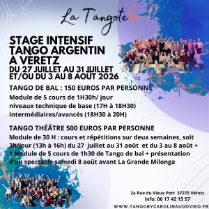 Module de 30 heures : cours et répétitions sur deux semaines, soit 3h/jour (13h à 16h) du 27 au 31 juillet ET du 3 au 7 août + 1 Module de 5 cours de 1h30 de Tango de bal (au choix, technique de base ou niveau intermédiaire/avancé) + présentation d'un spectacle samedi 9 août avant La Grande Milonga de cloture + entrée à toutes les milongas. Lieu : Salle Eugene Bizeau, 39 avenue de la Guérinière, 37270 Véretz