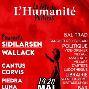 Nous avons le plaisir de vous annoncer la 6e édition de la fête de l'Humanité Poitiers. La fête commence le vendredi soir autour d'un banquet républicain et d'un bal trad ouvert à tou.t.e.s . La journée du 20 mai accueillera un village associatif, des expositions, des débats, des animations, un grand vide-grenier et des concerts. Au programme pour la soirée concert de cette année :