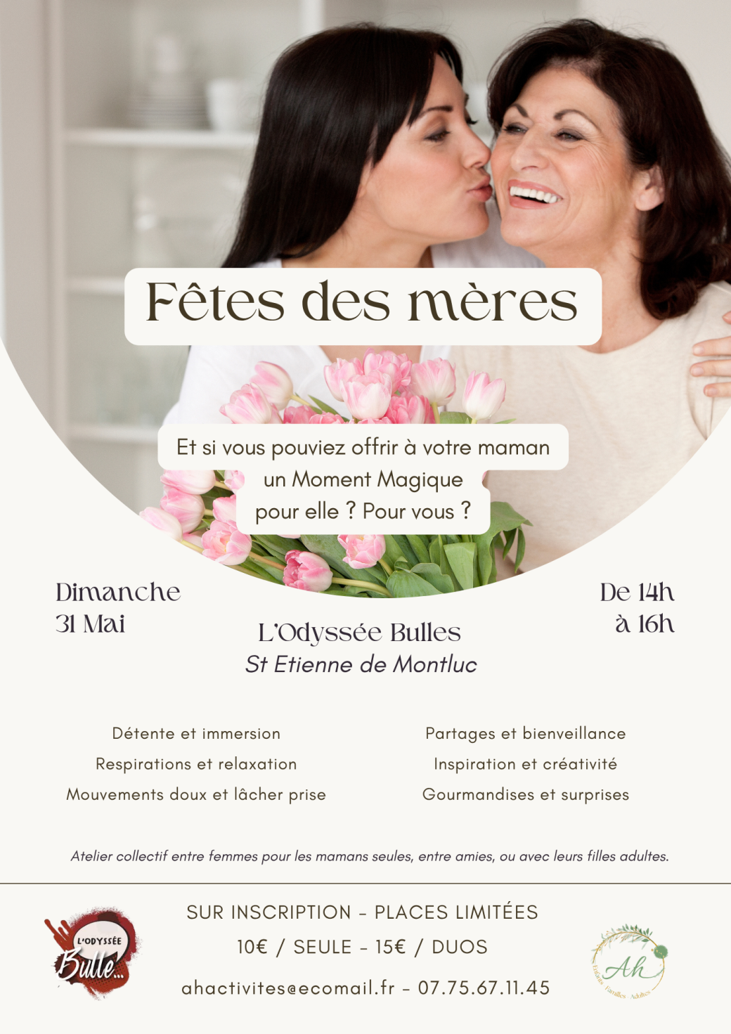 Offrir cette activité Mon Moment Magique à une maman, c'est lui offrir un moment pour elle, pour se poser, souffler, se ressourcer mais aussi découvrir, sourire, partager avec d'autres mamans pour cette belle journée que nous pourrons célébrer dans le jardin de l'Odyssée Bulle à Saint Etienne de Montluc.
