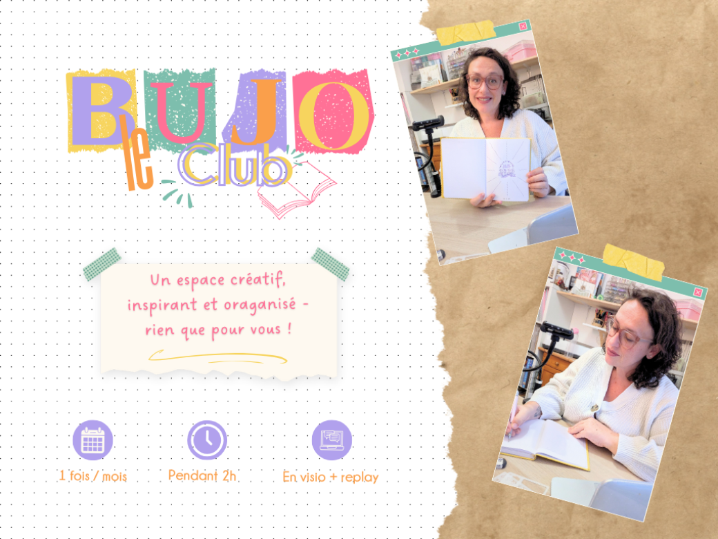 Professeur des écoles de mon premier métier, je suis également passionnée par la pédagogie et la transmission auprès de tout public. Depuis 2020, je donne des ateliers créatifs pour petits et grands en tout genre et c'est avec joie que je te retrouve aujourd'hui pour te proposer des ateliers de Bullet Journal en visio 1 fois par mois en intégrant le Club Bujo pour t'organiser tout en créant à ton rythme.