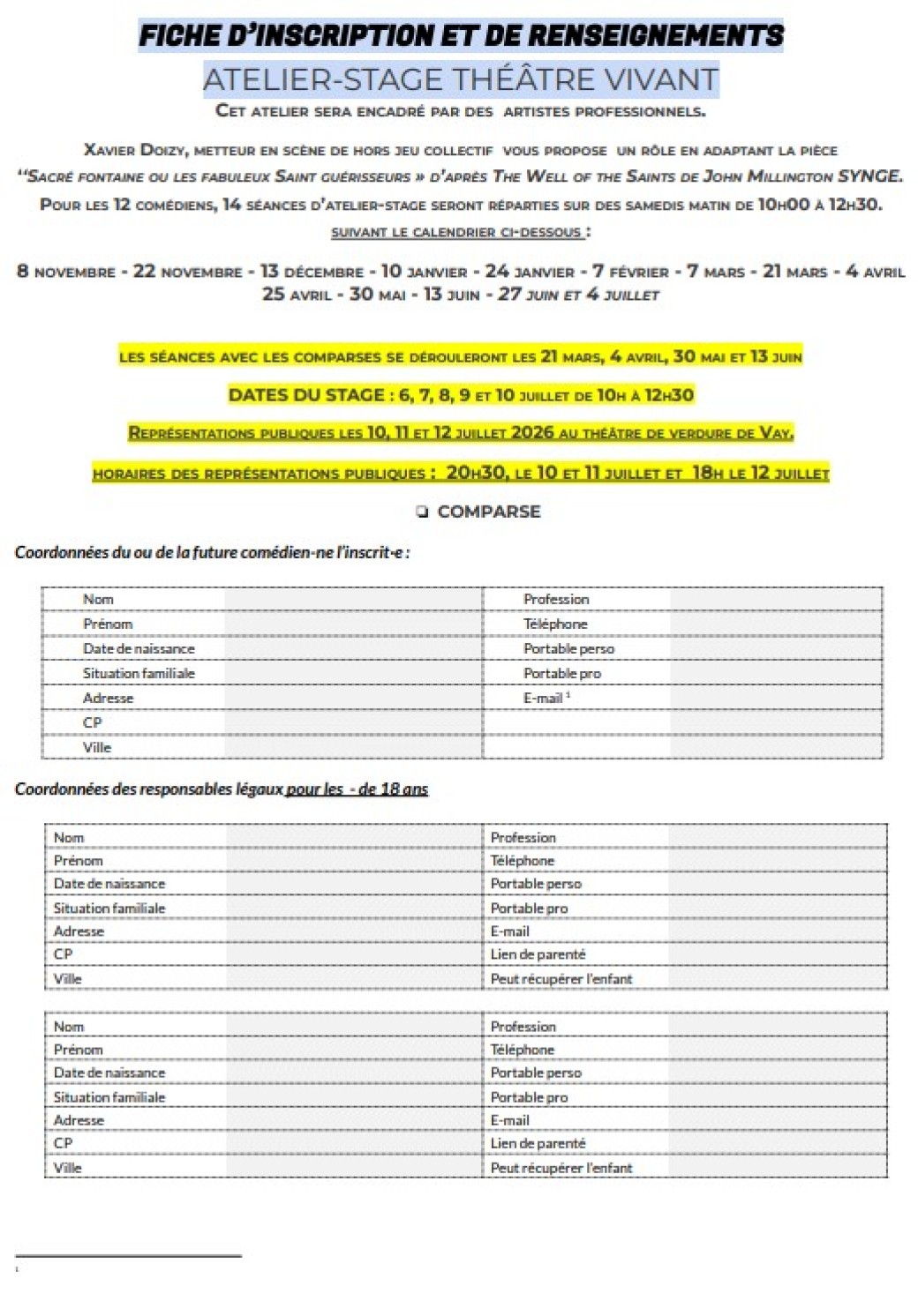En septembre dernier, nous avons lancé un atelier de stage de théâtre vivant. Douze comédiens, débutants ou initiés, ont ainsi commencé le travail autour de la pièce « Sacré Fontaine », adaptée par Xavier Doisy, artiste professionnel de la compagnie Hors Jeu Collectif à Vay.