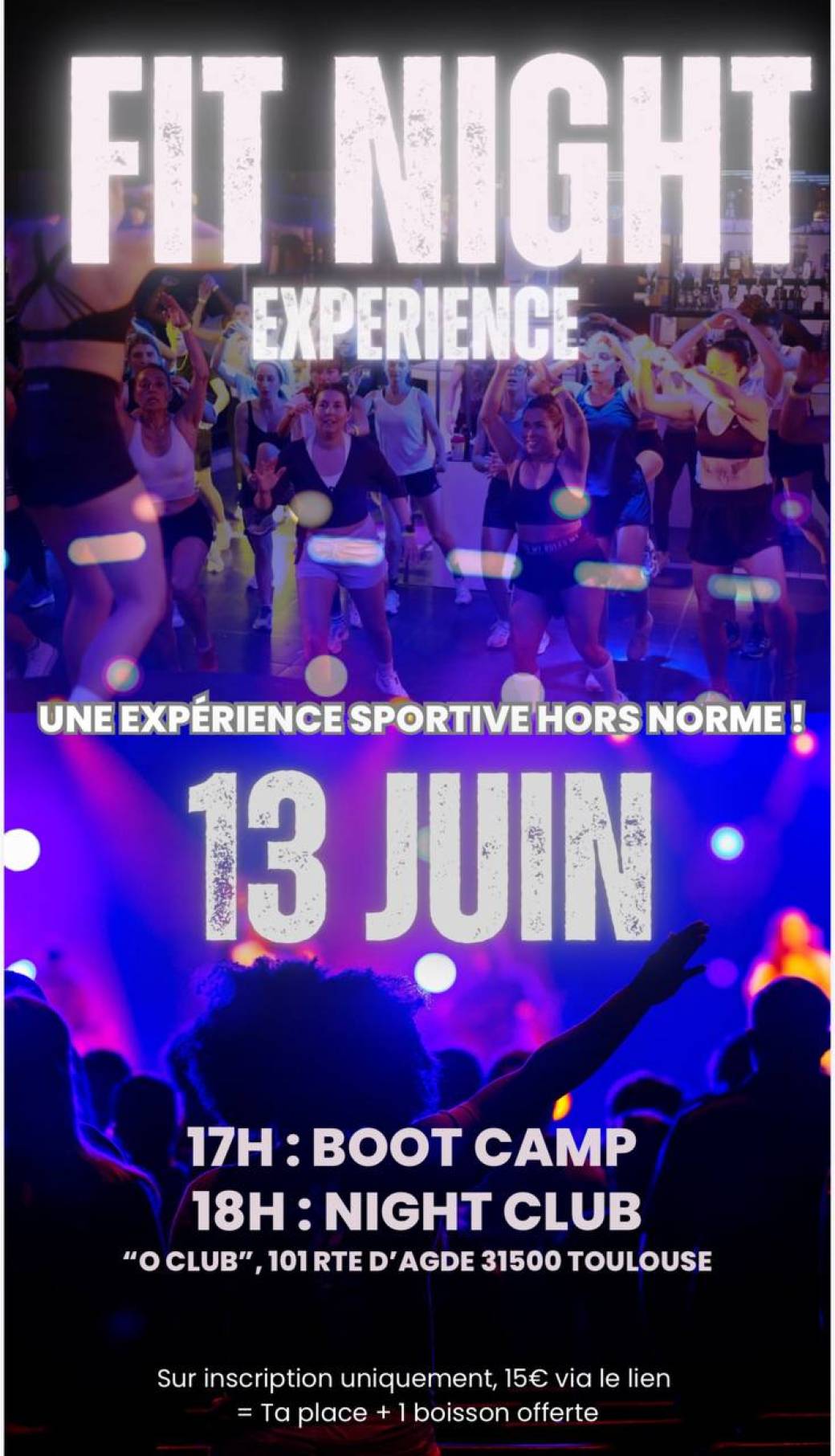 17h/18h : séance de sport, 18h/19h : à fond sur le dancefloor pour danser pour ceux qui le souhaitent, et une boisson de récupération offerte avec votre billet :D Musique: tout genre!