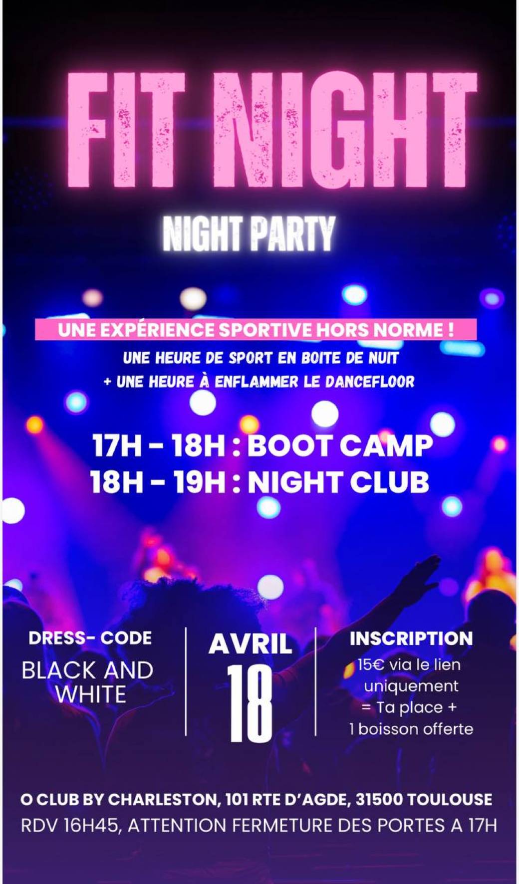 17h/18h : séance de sport, 18h/19h : à fond sur le dancefloor pour danser pour ceux qui le souhaitent, et une boisson de récupération offerte avec votre billet :D