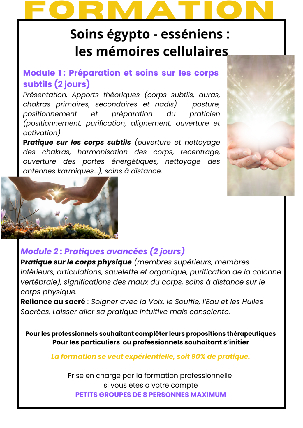 2026-11-18 09:30:00 2026-11-21 17:30:00 Europe/Paris Formation aux soins esséniens : les mémoires cellulaires Reservations on : https://www.billetweb.fr/formation-aux-soins-esseniens-les-memoires-cellulaires -- Et si vous pouviez renouer avec la sagesse millénaire des thérapeutes esséniens ? Cette formation unique vous invite à découvrir une voie de guérison énergétique et spirituelle, inspirée des enseignements sacrés transmis depuis des siècles.   Les soins esséniens, c’est bien plus qu’une technique : C’est un art de ressentir, d’écouter, d’accueillir. Une pratique qui agit sur les plans physique, émotionnel, mental et subtil, pour restaurer la circulation de l’énergie vitale et libérer les mémoires profondes.   Au programme de la formation : Les bases de l’énergétique et des champs vibratoires Le rôle de la respiration et de la prière dans le soin L’écoute intuitive et la lecture du corps de lumière Les gestes et protocoles des soins esséniens Un accompagnement progressif, entre enseignements théoriques, pratiques guidées et partages d’expérience   Pourquoi suivre cette formation ? Pour développer vos capacités de ressenti et d’intuition Pour apprendre à… Vidouze, France Carole Barreau