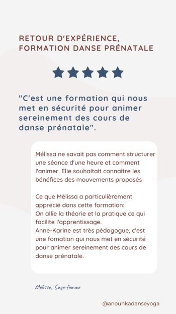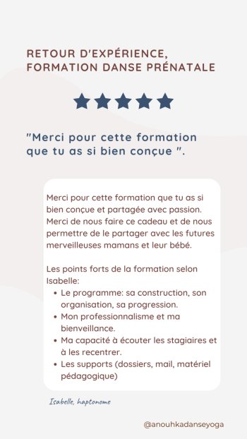 2026-10-20 09:00:00 2026-12-01 17:00:00 Europe/Paris Formation "Créer et animer des ateliers de danse prénatale". A distance octobre 2026 Reservations on : http://www.anouchka-danse-yoga.fr/ -- Dans cette formation, vous apprendrez comment créer et animer des cours de danse prénatale. Quelque soit votre expérience en danse, vous serez capable de proposer des enchaînements simples et sécuritaires aux femmes enceintes que vous accompagnez. Ala fin de cette formation vous saurez: Créer des enchaînements simples avec un objectif précis (étirer le dos, faire de la place à bébé, mobilité du bassin...) Structurer un cours de danse prénatale d’une durée d’1h Créer des cours à votre image, qui vous ressemble (il n’y a pas de chorégraphie à apprendre) Animer en toute confiance une séance de danse prénatale Comment mettre la danse au service de la physiologie durant la grossesse et l’enfantement Connaître les bénéfices et l’intérêt des mouvements que vous proposez Amener les femmes à se reconnecter à leur corps, à leur bébé Formation à distance Anouchka Danse et Yoga