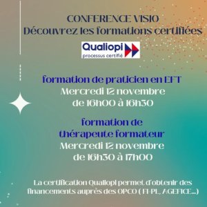 2025-11-12 16:00:002025-11-12 17:30:00Europe/ParisFormation EFT certifiée Qualipoli et Formation de thérapeute formateurReservations on : https://www.billetweb.fr/formation-etf-certifiee-qualipoli-et-formation-de-therapeute-formateur