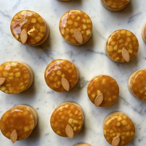 Gelée de pomme caramélisée à la cannelle avec glaçage neutre, sablé à l’amande, cake à la pomme, crème pâtissière à la vanille