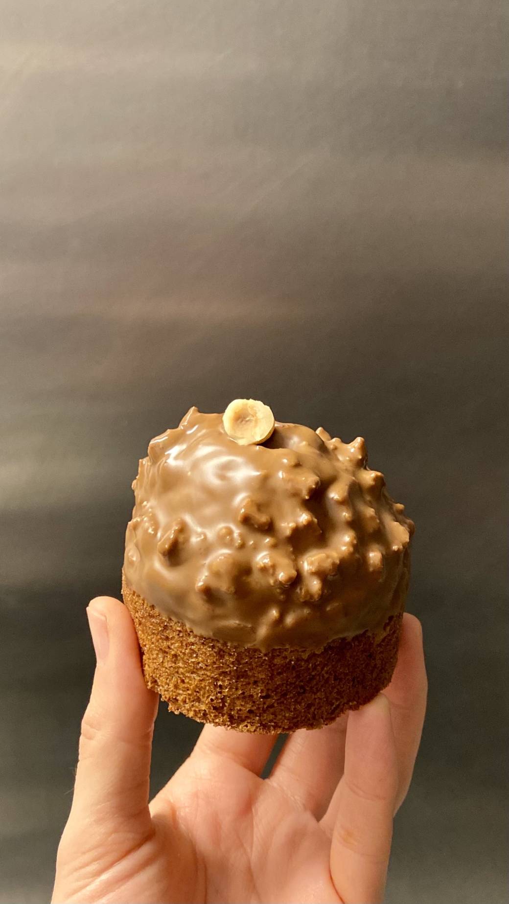 Mousse à la noisette, praliné noisette, cake gianduja, crumble au cacao, glaçage noisette et glaçage velours.