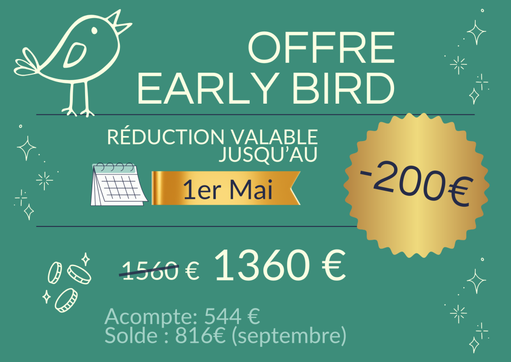 Acompte 624€ à l'inscription - solde 936€ le 5 septembre