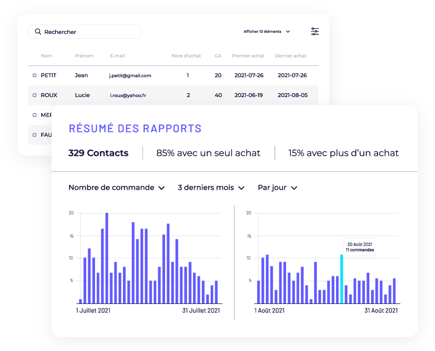 Vous pouvez facilement accéder à l'historique d'un client, identifier des tendances, créer des segments ou mesurer l'effet de vos opérations marketing.