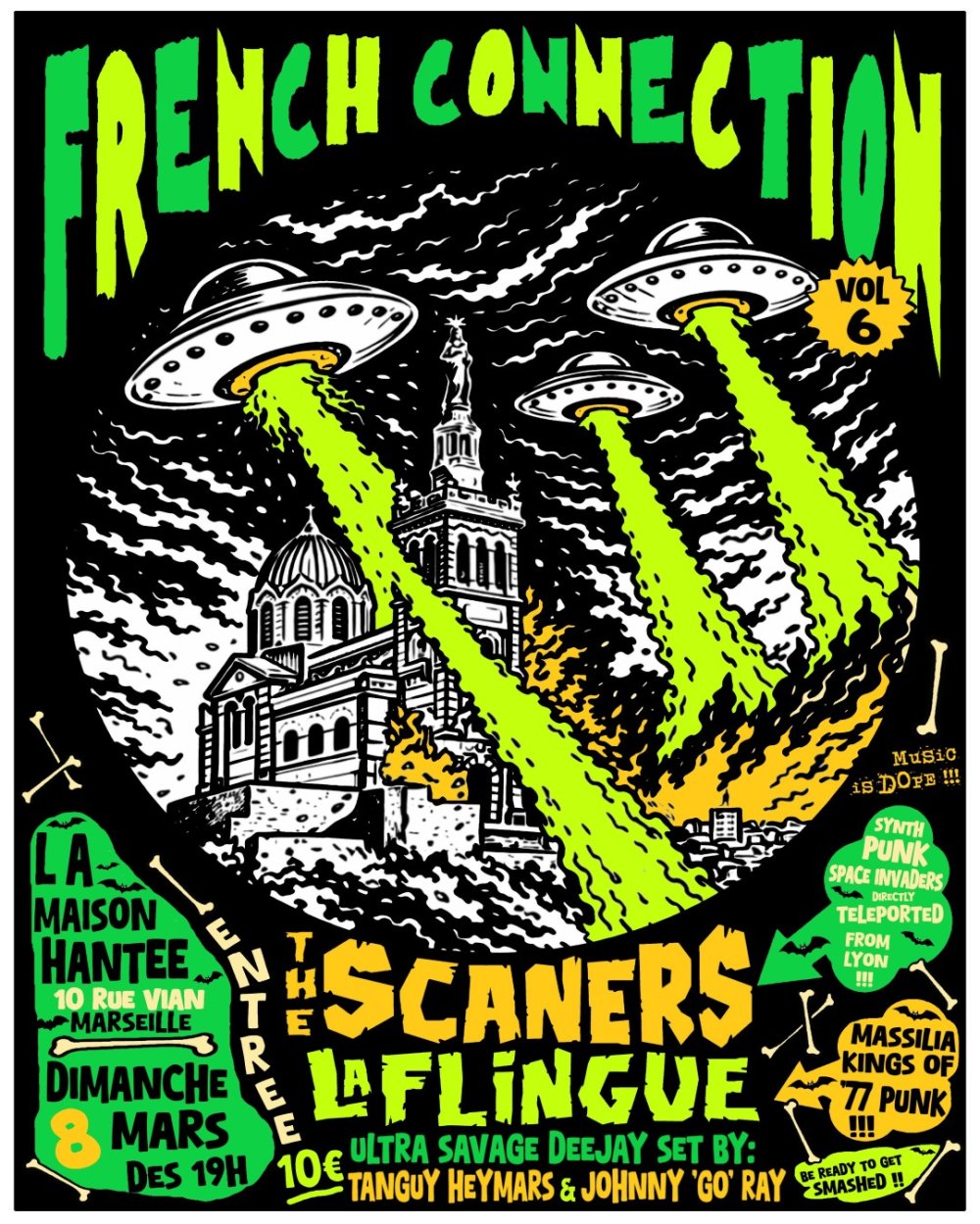 21h45 : THE SCANERS ! Et hop un genre de copié/collé (merci Adrenalinfix music !) avec deux ou trois modif. Faute avouée à moitié, bref on s’en tape et voilà des SPACE INVADERS qui débarquent à Marseille, des Synth. PunX ! La thème de la promo. « CHEH, la Bonne Mère !!! »