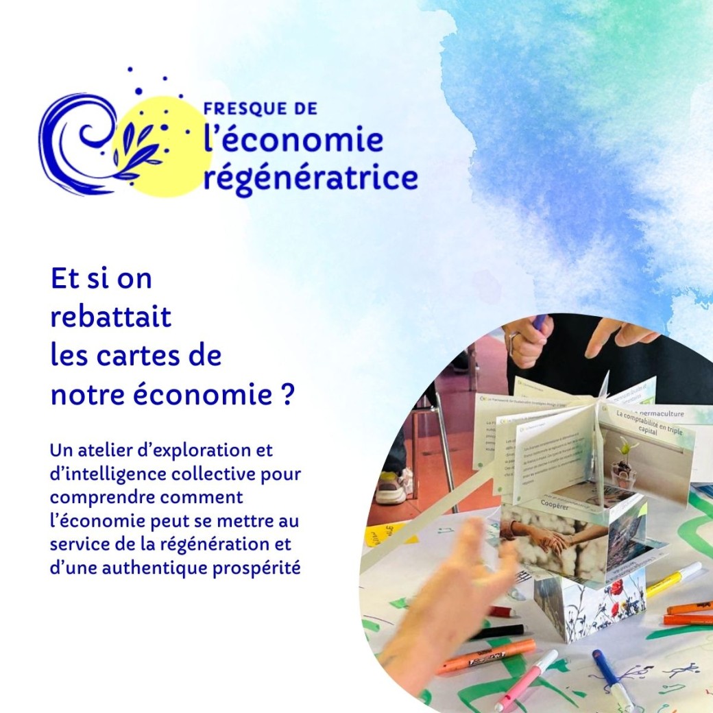 Inspirée de la Permaéconomie, la fresque de l'économie régénératrice est un atelier d’exploration et d'intelligence collective d’une durée totale de 3 heures destiné à découvrir comment, par l'activité économique, il est possible d’activer les leviers d'action à notre portée pour régénérer la vie et co-construire un avenir prospère.