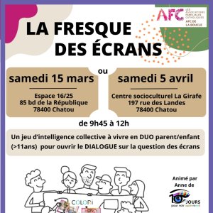 Inspirée de la Fresque du climat, la Fresque des écrans est un jeu d’intelligence collective sans écran qui permet de comprendre le fonctionnement du numérique pour mieux cerner ses dangers et ses opportunités. Les participants repartent avec des actions concrètes pour un usage serein et confiant par les enfants, et un accompagnement ajusté des parents.
