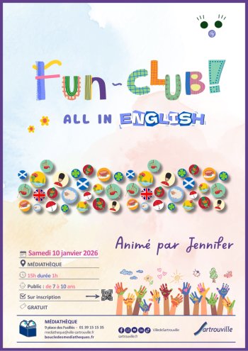 2026-01-10 15:00:00 2026-01-10 16:00:00 Europe/Paris Fun Club à la médiathèque Reservations on : https://www.boucledesmediatheques.fr/Sartrouville -- Pour les enfants de 7 à 10 ans. Atelier ludique et interactif "All in English" animé par Jennifer. Gratuit sur inscription Médiathèque de Sartrouville, Place des Fusillés, Sartrouville, France Médiathèque de Sartrouville