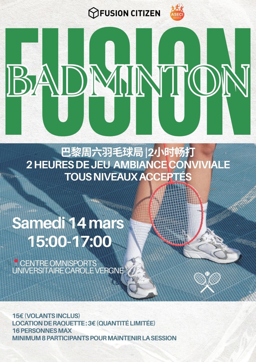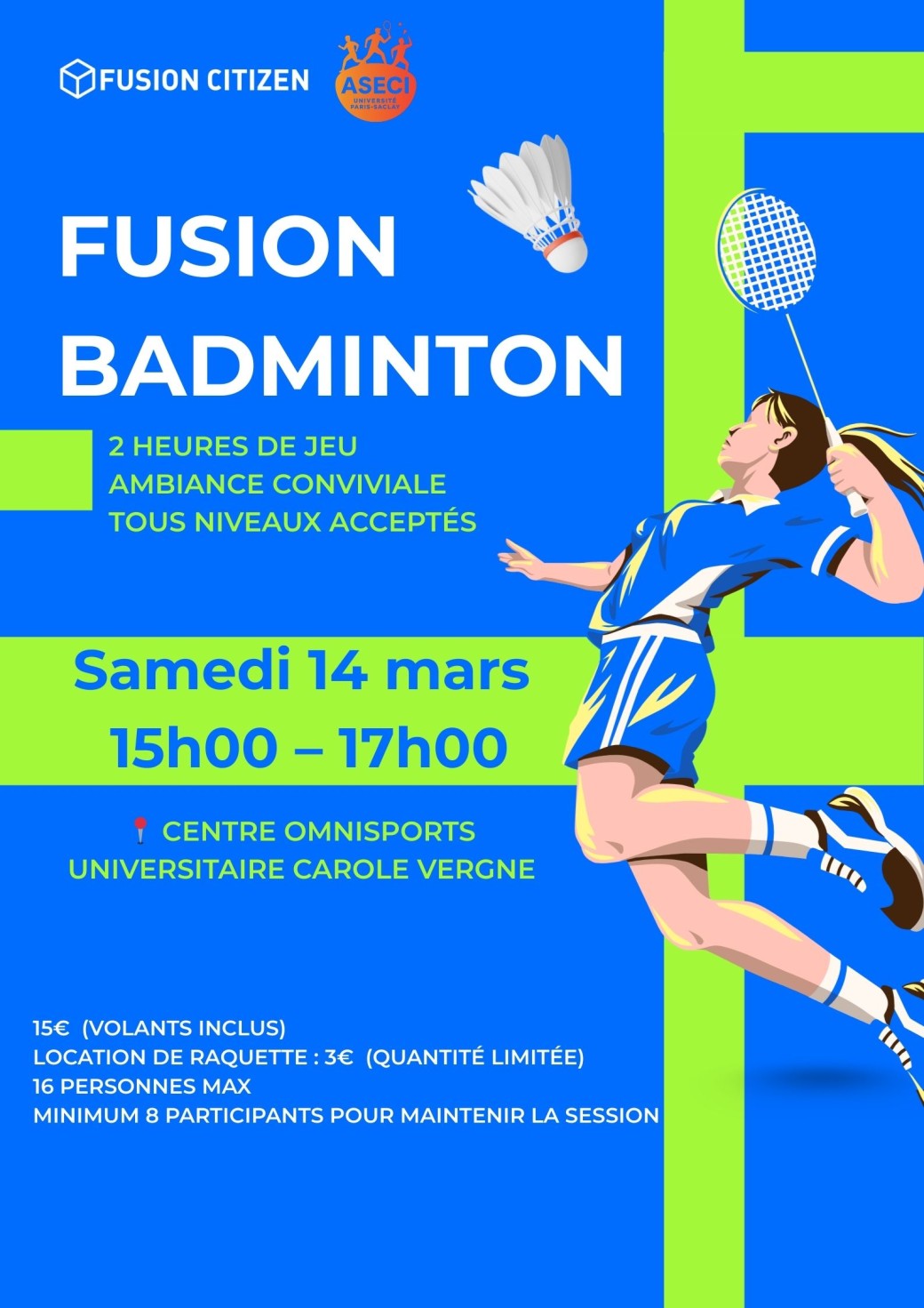Nous organisons une session de badminton de 2 heures dans un grand gymnase universitaire à Palaiseau.