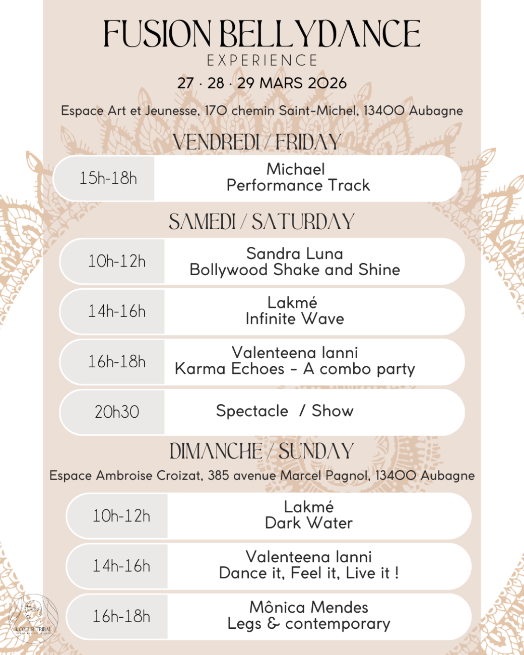 Bienvenue à la seconde édition du Fusion Bellydance Experience, un événement unique dédié aux passionnés de danse Tribal fusion et de danse orientale ! Rejoignez-nous pour un weekend immersif, riche en découvertes artistiques et en connexion avec des danseurs et professeurs de renom.Aubagne, FranceA COEUR TRIBAL